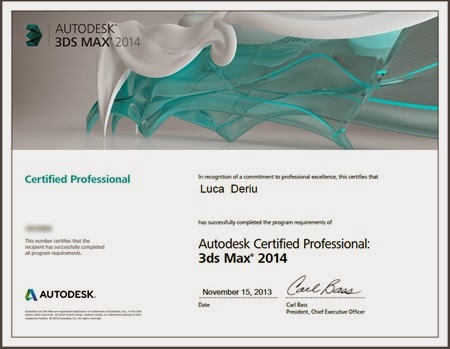 For this great satisfaction I have to say thanks to UPGRADE: Donato Cremonesi, Blerina Pashollari, Valeria Pizzi, Valeria Casanova and Gianluca Melcangi. I use Max since Kinetix/Discreet time, when the software was known with the name “3D Studio Max r2”, but Upgrade organized the exam and offered me performant computer and confortable structure to attend it (plus coffee before exam!).